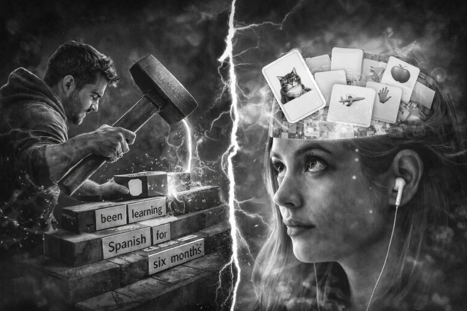 Black-and-white ultrarealistic split image contrasting two language learning approaches: on the left, a man forcefully assembling sentence blocks with a hammer and sparks flying, symbolizing active sentence construction; on the right, a woman wearing earphones with blank flashcards floating above her head, representing passive vocabulary exposure.